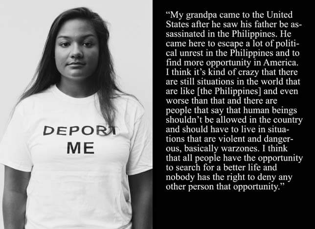 Rosenberg asks participants to be photographed wearing a T-shirt printed with the words “DEPORT ME” in order to echo the gesture that free people have often enacted when the rights of others are in jeopardy, a gesture of solidarity that confuses those that would prey on the undocumented, the “outsiders” and the “others.” Not dissimilar from the gesture made by non-Jews of placing a menorah in the window as an act of solidarity, The Deport Me Project asks viewers to consider, in the anti- immigration frenzy, how we know who among us is a citizen, who has the right to be among us, and who decides? It is an activist art project that is intended to raise awareness of the unjust and inhumane practice of family separation, mass deportation, and denial of due process to asylum seekers. Deportation often reverses the long and arduous travel that has brought individuals to this country; it effectively returns them to the cycle of endless diaspora that dehumanizes and exhausts both people and institutions that would try to unravel such practices. The first trio of images is seen alongside text panels capturing the individual’s family history of travel and displacement. The second group of photos are individual portraits of New Yorkers, most of whom have traveled to the city by choice. They stand on lower Second Ave. with the background of midtown and the Upper West Side in the distance, attainable but seemingly quite a journey away. Rosenberg, whose own ability to travel freely is unimpaired, despite his familial immigrant origins, gathers groups of people in cities across the country, asking them to stand in solidarity with their community members by posing with the emphatic prompt across their chests. Why not Deport ME? Take me instead.